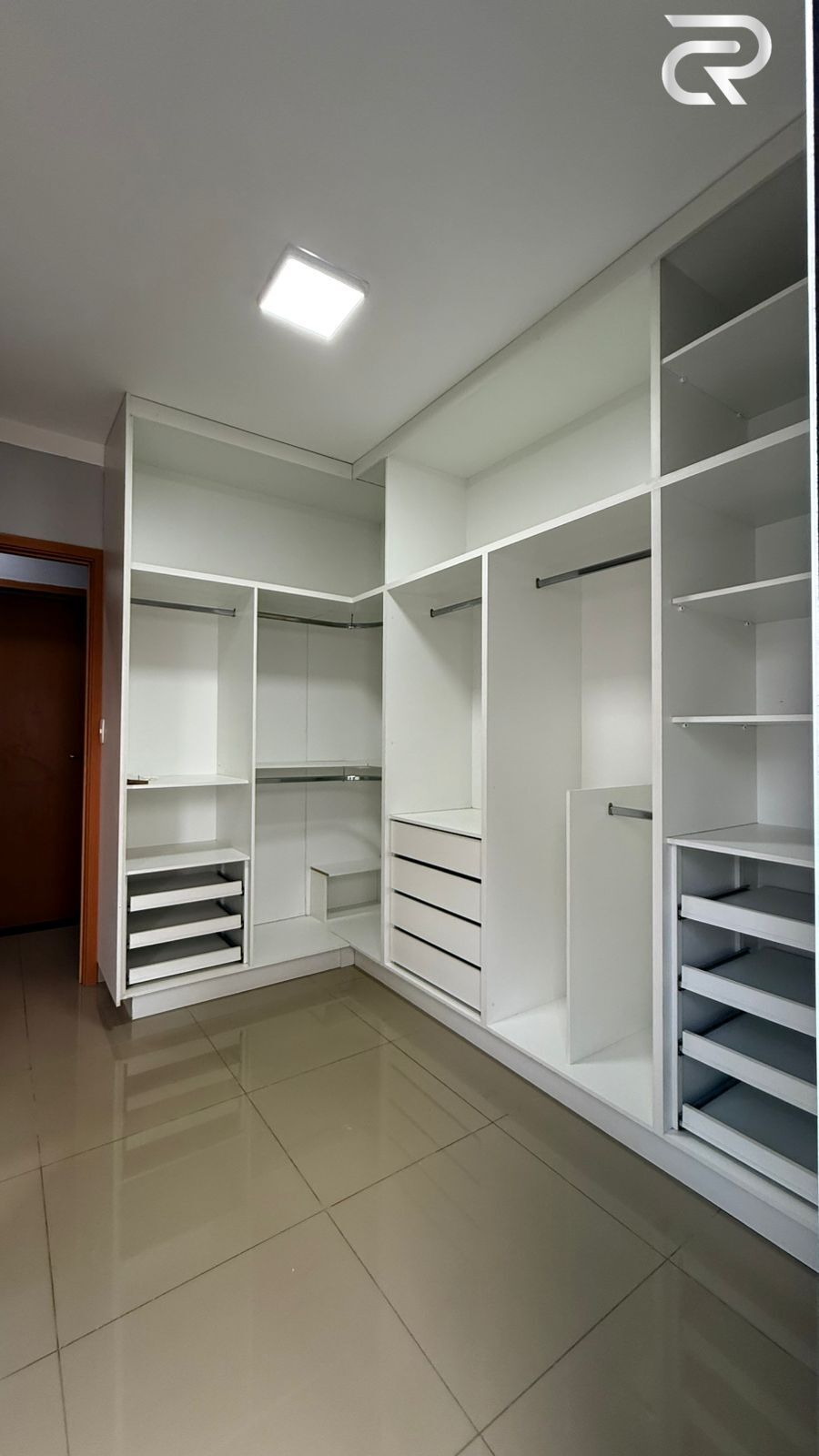 Closet montado em um dos quartos com espaço para utilização de escritório ou dormitório